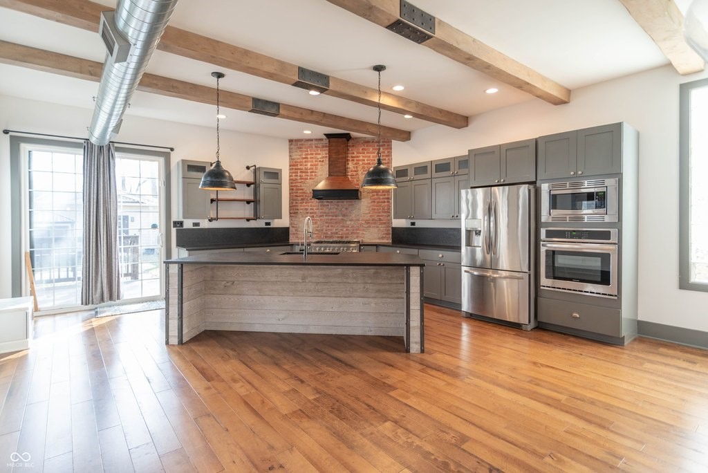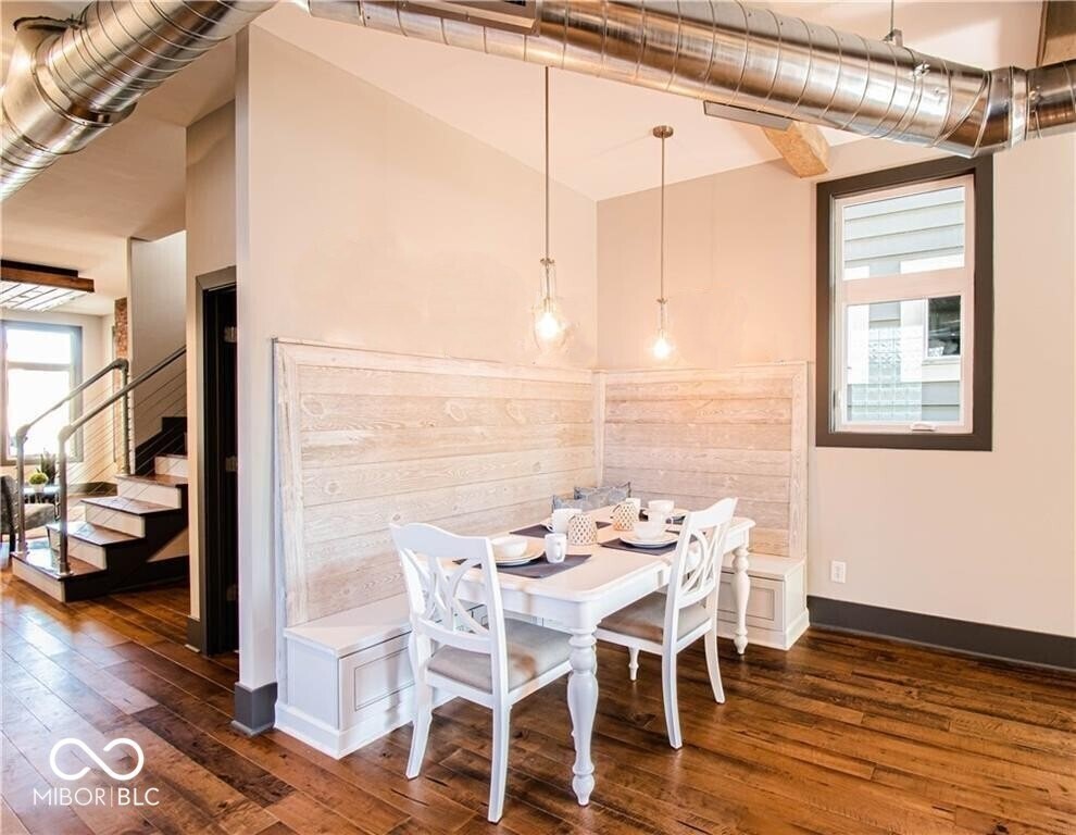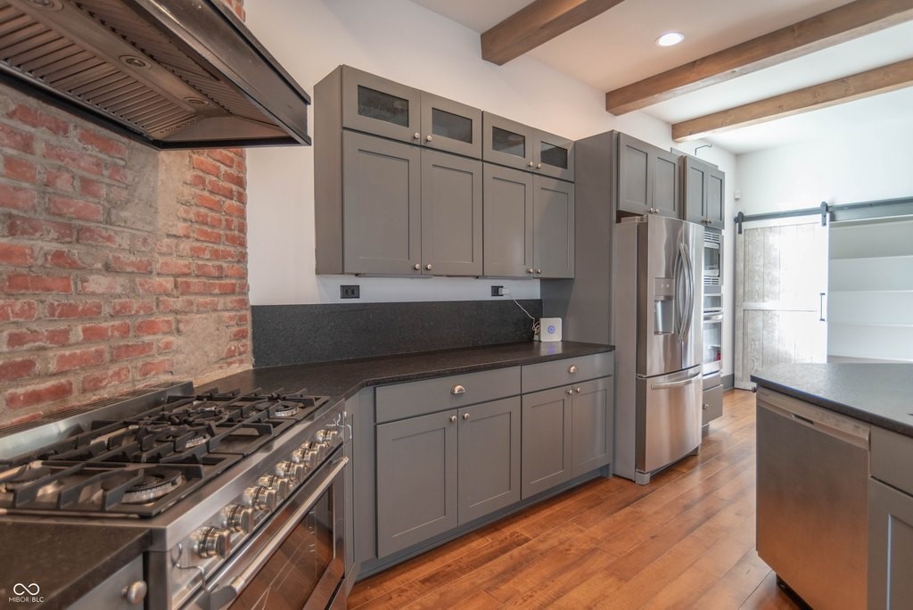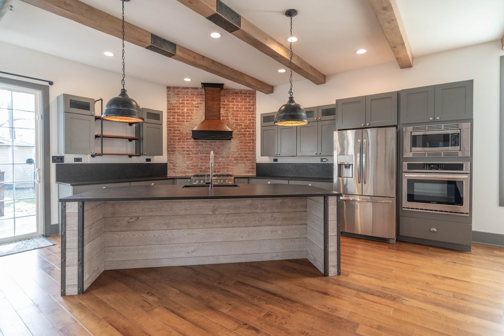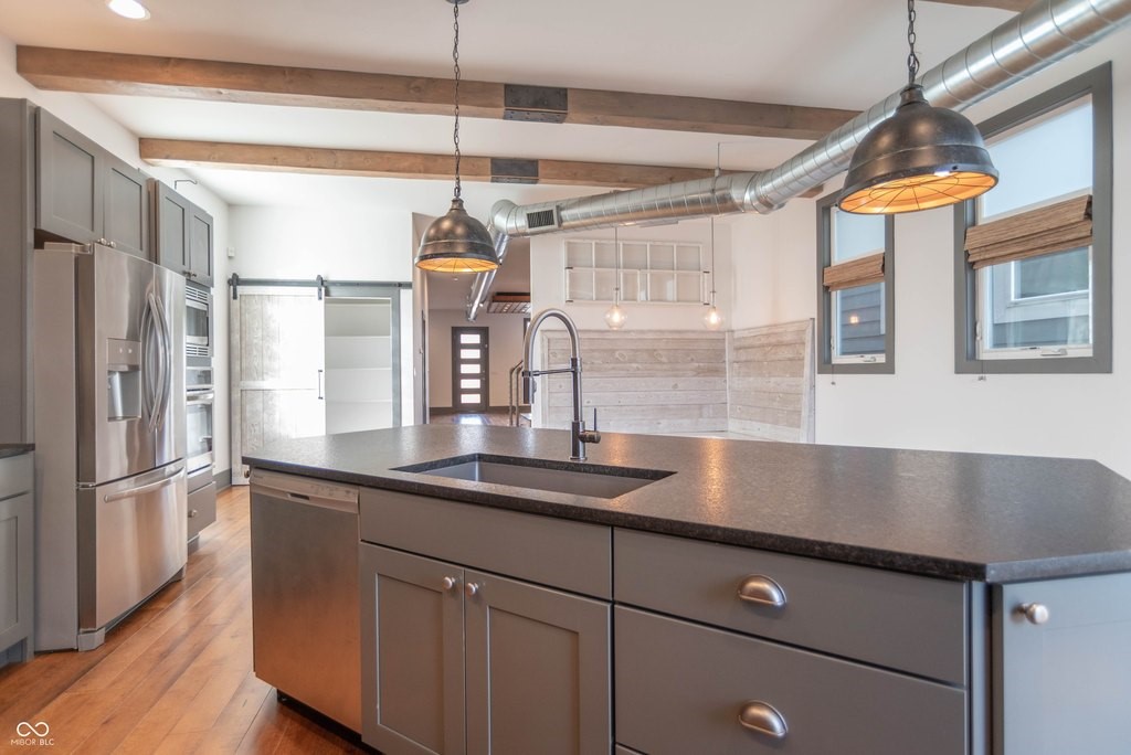 This stunning home is where modern luxury meets the timeless charm of a warehouse loft, with beautifully designed living spaces, featuring soaring ceilings, high-end finishes, and thoughtful upgrades throughout. From the moment you step inside, you'll be captivated by the architectural character. The expansive living area is highlighted by a brick hearth with a sleek electric fireplace. You'll find hand-scraped hardwood flooring throughout the first floor, staircase, and loft, adding warmth and character. Multiple sliding barn doors enhance the modern industrial aesthetic while maximizing space and style.The gourmet kitchen features top-of-the-line stainless steel appliances, a gas range, double ovens, and gorgeous leathered granite countertops. A large center island provides space for bar stool seating, while the custom built-in banquet creates the perfect dining nook-complete with hidden storage drawers and a spacious walk-in pantry. The luxurious primary suite features a sitting area and dedicated office space, ideal for relaxing or working from home. The spa-inspired primary bathroom is elegantly designed with backlit mirrors, a double vanity, and a stunning tiled walk-in shower with glass doors and a rain shower head, creating a resort-style experience. Upstairs you'll also find two more generously sized bedrooms with walk-in-closets and a Jack & Jill bathroom. Step outside to your own private backyard oasis. The fully fenced yard, large deck, and a beautiful gazebo with a dedicated grilling/patio area, make it perfect for any occasion. The immaculate insulated two-car garage is finished with wood wall panels, a metal ceiling with overhead lighting, and garage heater, creating the perfect space. Every inch of this property has been meticulously maintained and thoughtfully designed, offering a perfect blend of industrial-inspired character, modern luxury, and everyday functionality. (Full list of amenities provided upon request.)